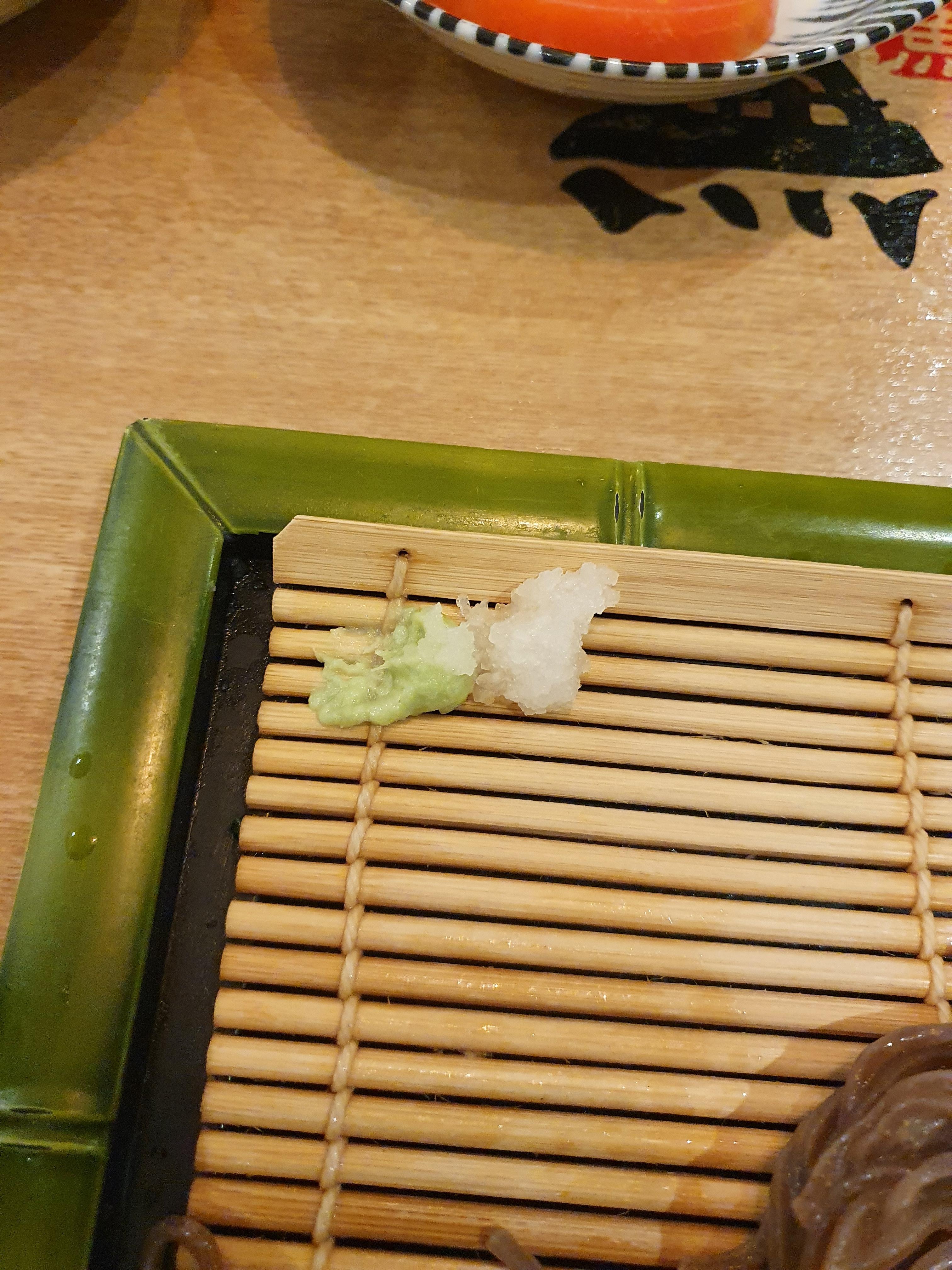 소바를 먹을땐, 간 무랑 와사비를 조금씩 섞어서 같이 먹습니다.