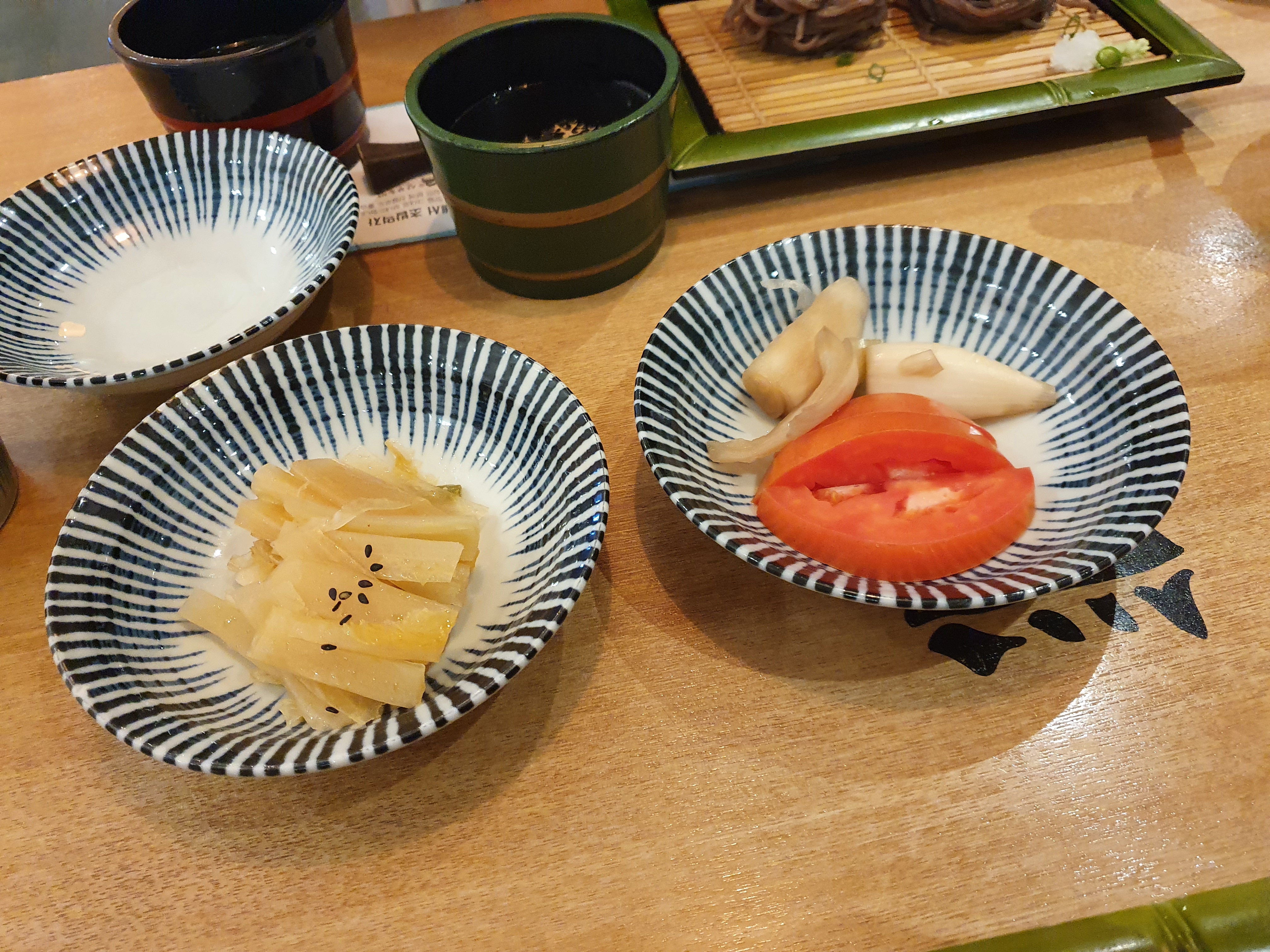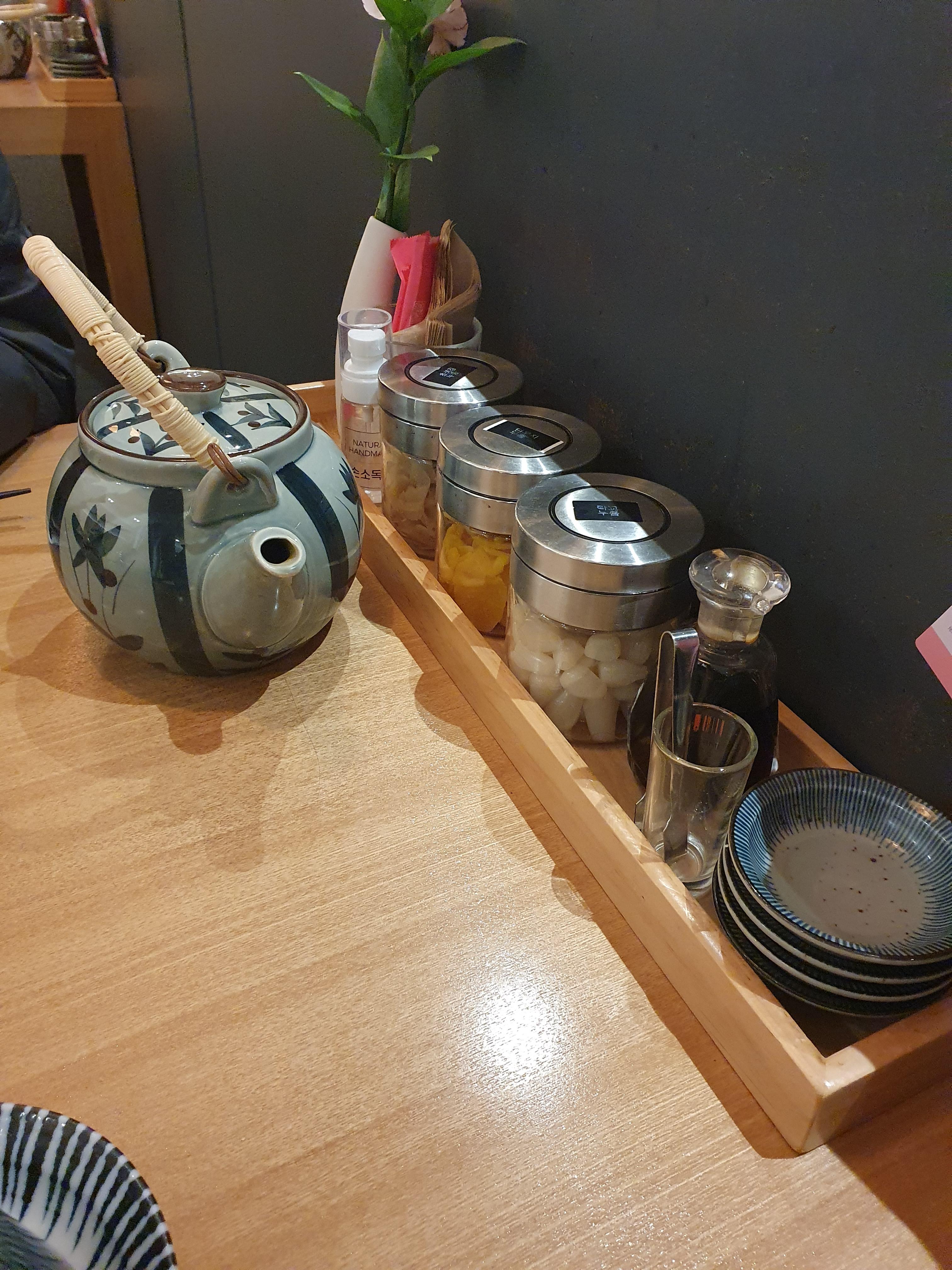 락꾜나 단무지, 생강절임은 테이블 끝에 위치하고 있으며, 먹을만큼 편하게 덜어서 드시면됩니다.