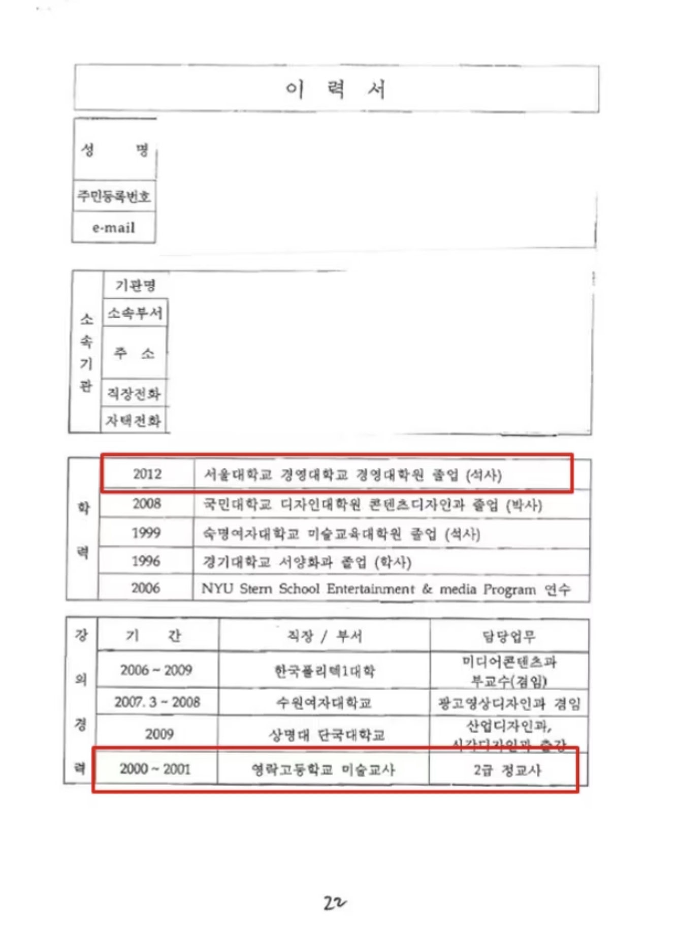 지금 쟁점이 되고 있는 허위 이력서의 내용 몇가지를 보자!