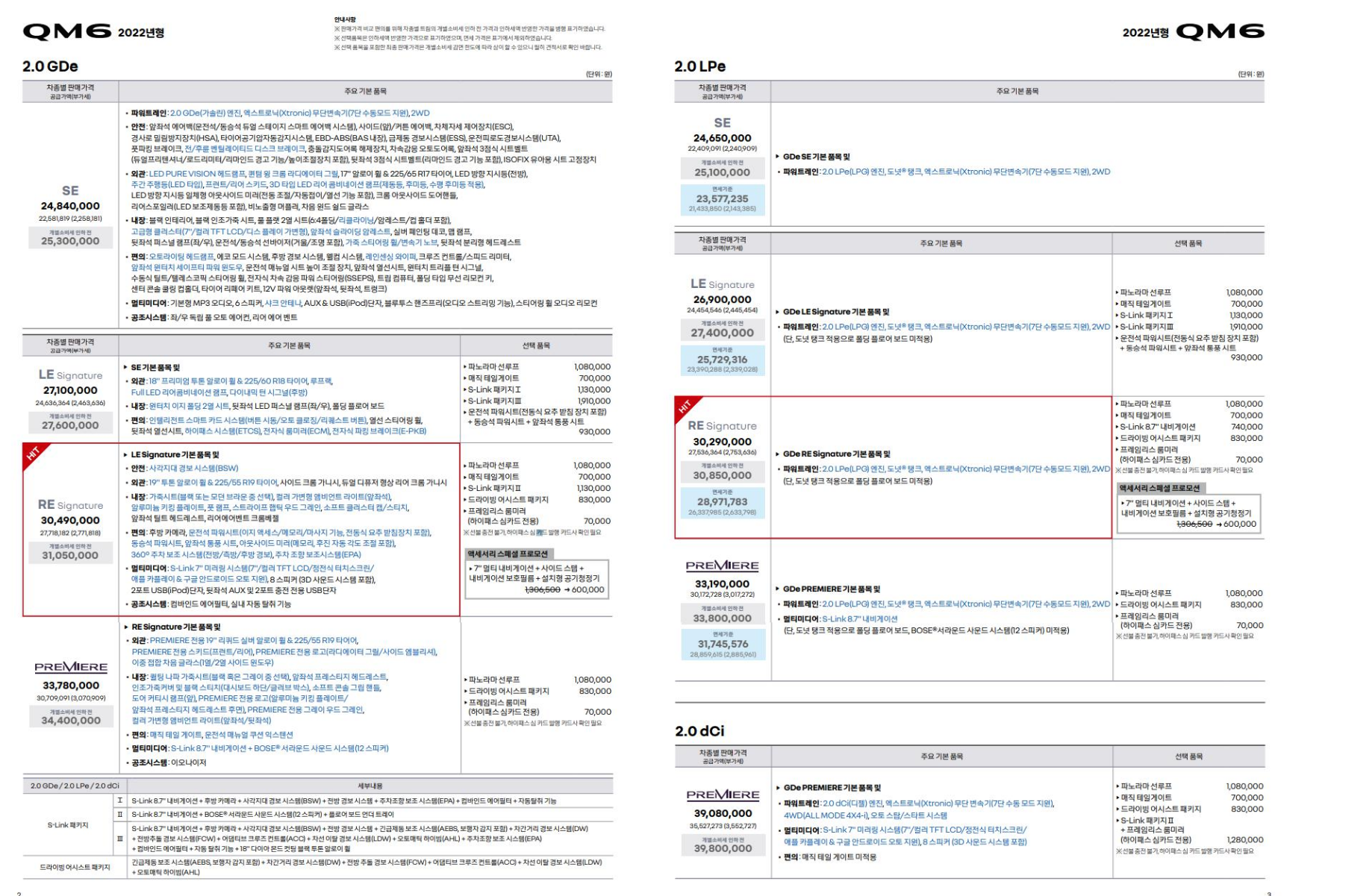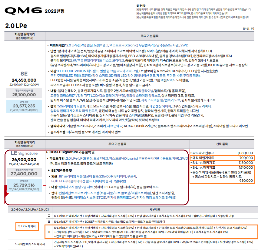 기존 qm6 가격표를 LPe로 보기 편하게 자체 편집을 하였습니다.
