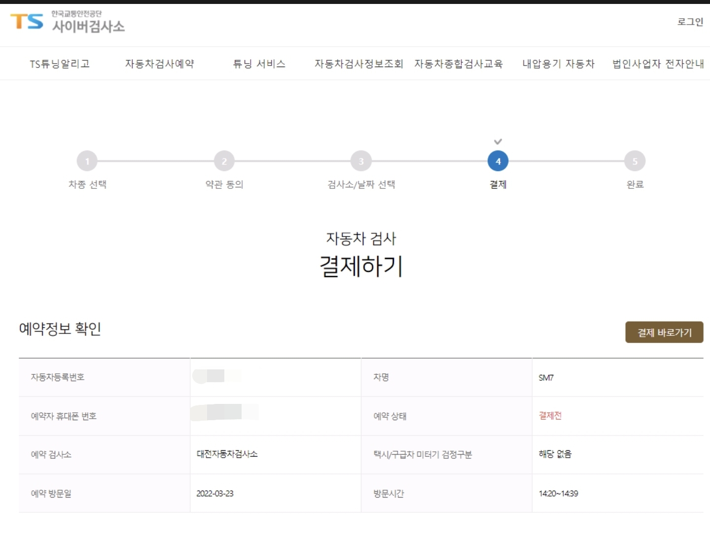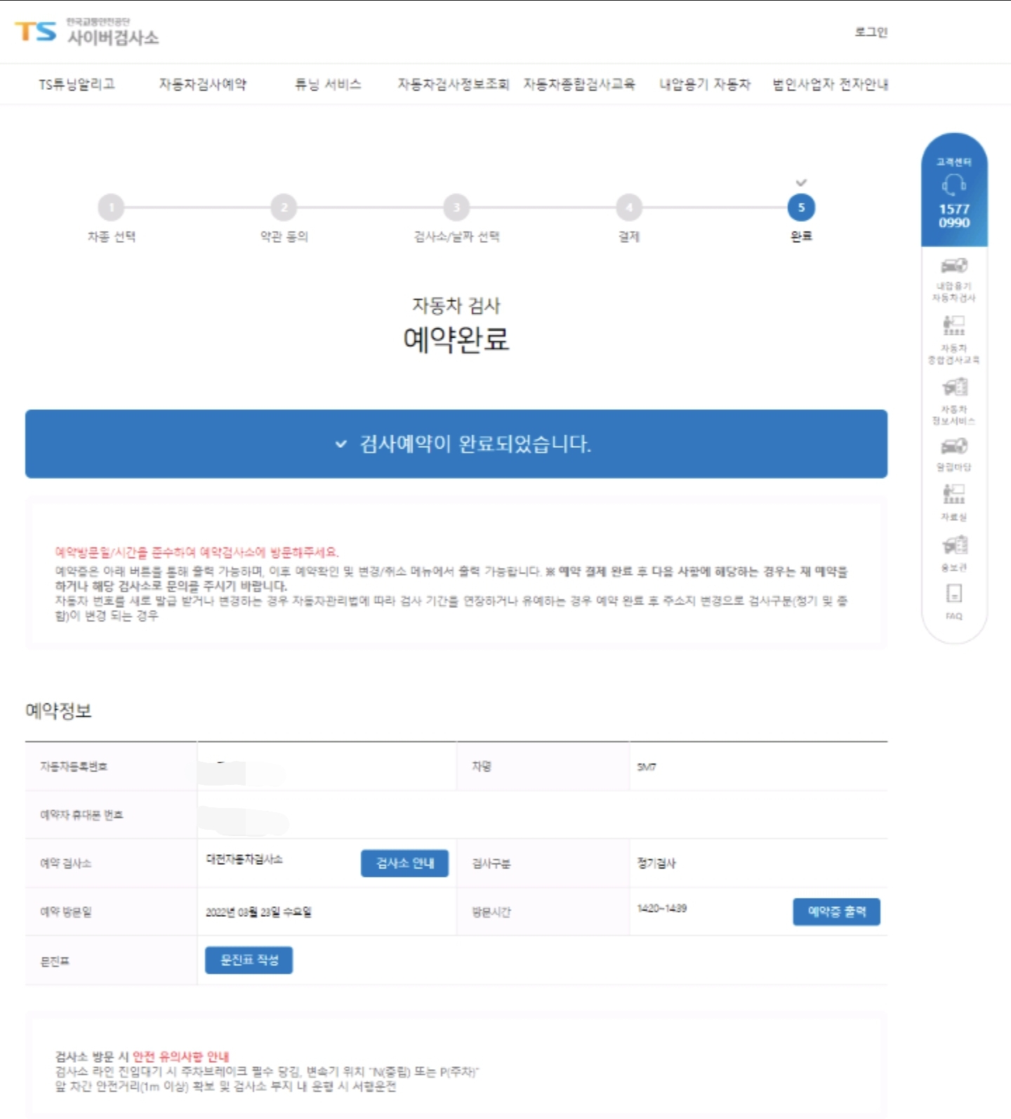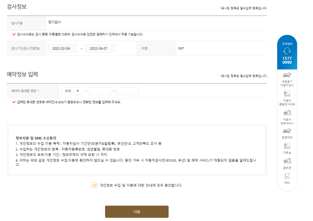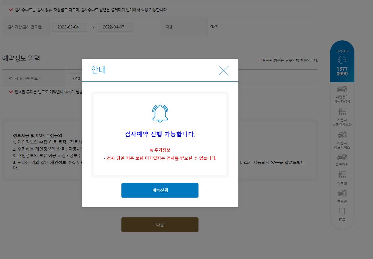 sm7 lpe 2.0 자동차 정기검사 예약이 완료 되었습니다.
