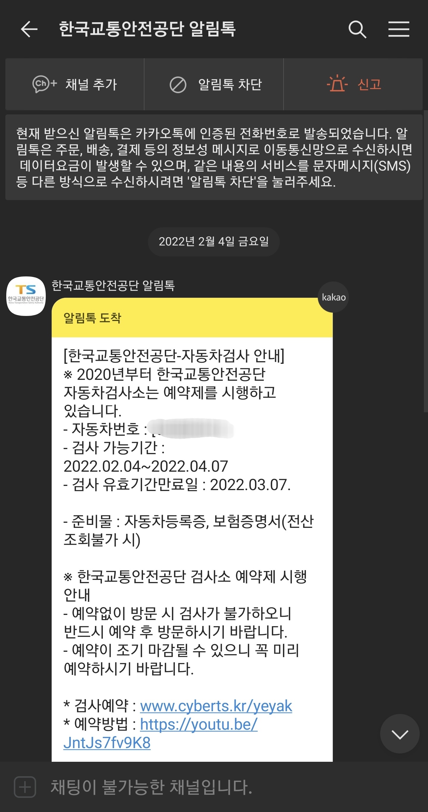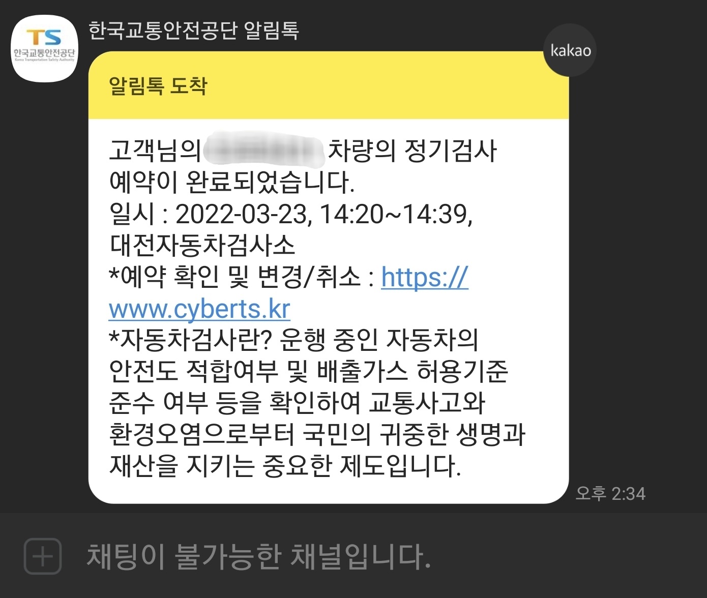 한국도로교통 안전공단에서 알림톡이 왔습니다.