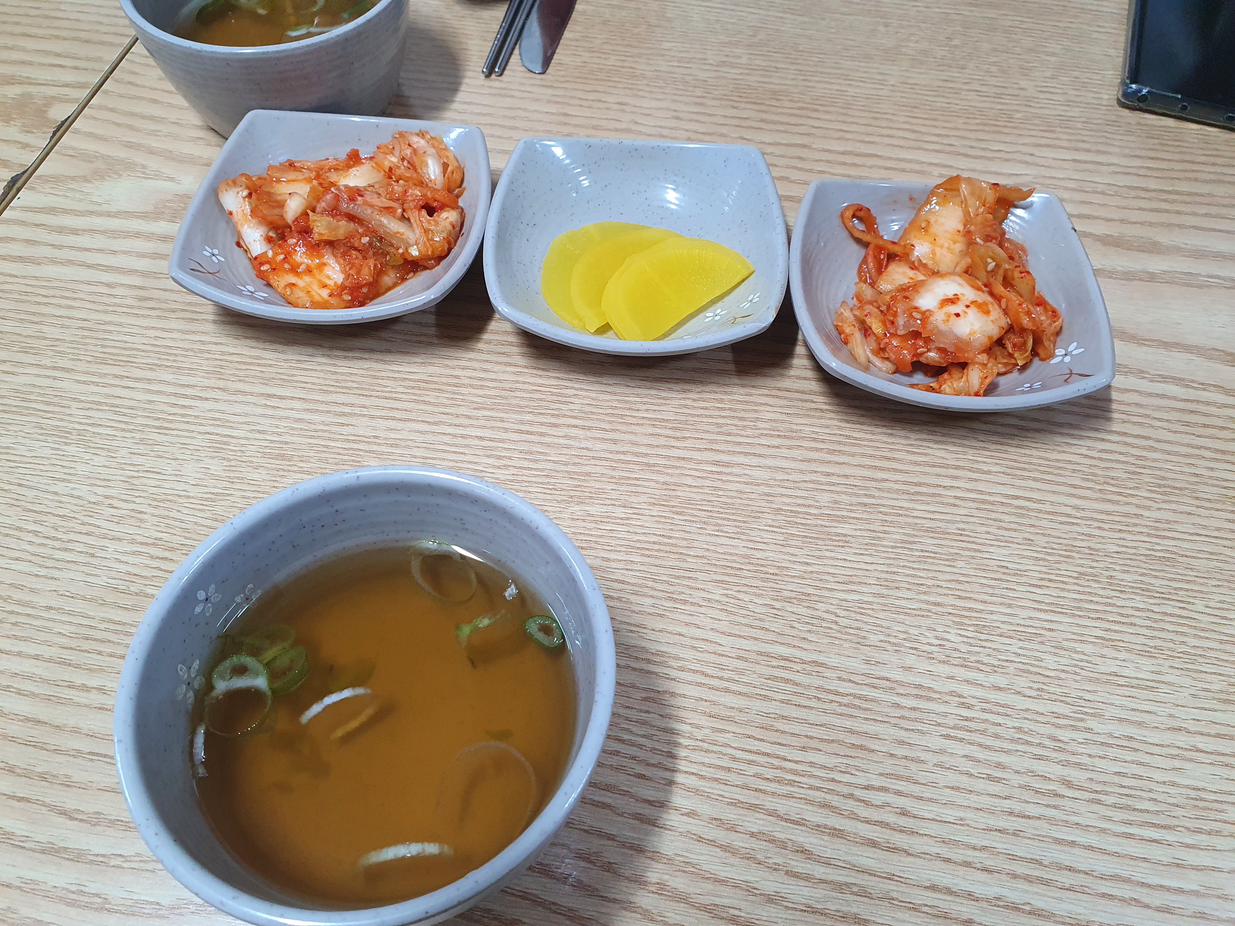 기본찬은 탕국이랑 배추김치 단무지가 있습니다.