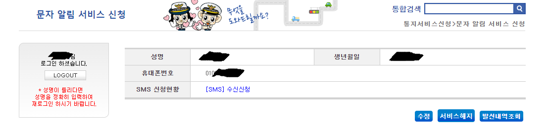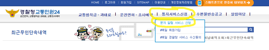 경찰청교통민원24 접속 - 상단 중간에 "통지서비스신청" - "문자 알림 서비스 신청" 선택