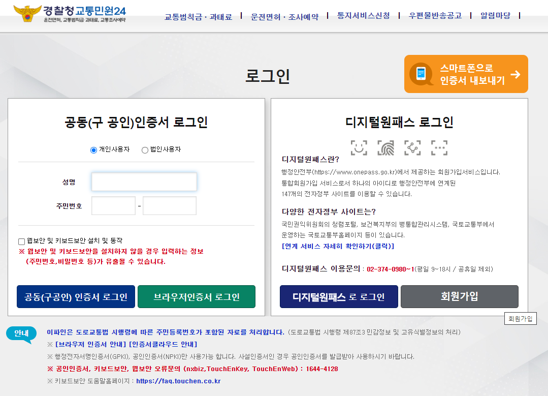 스마트폰으로 보려면 "디지털원패스 로그인"에 가입을 해야 경찰청 교통민원24 이파인에 로그인이 가능합니다.