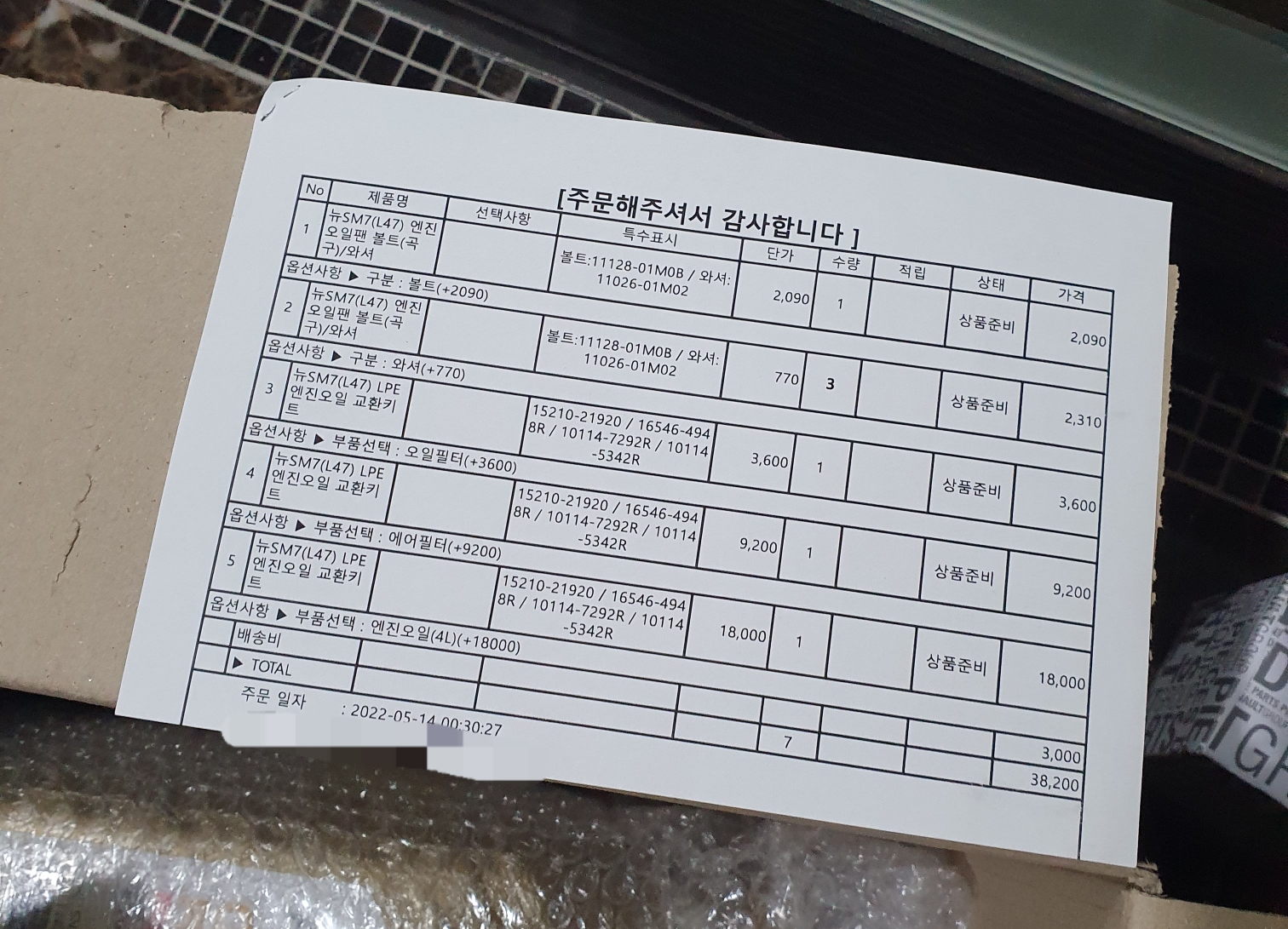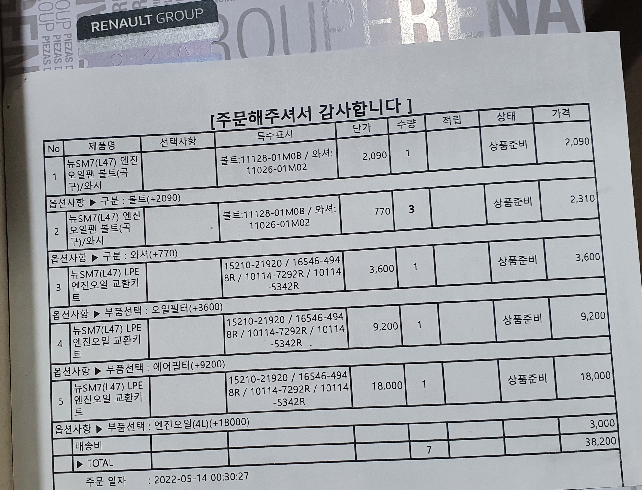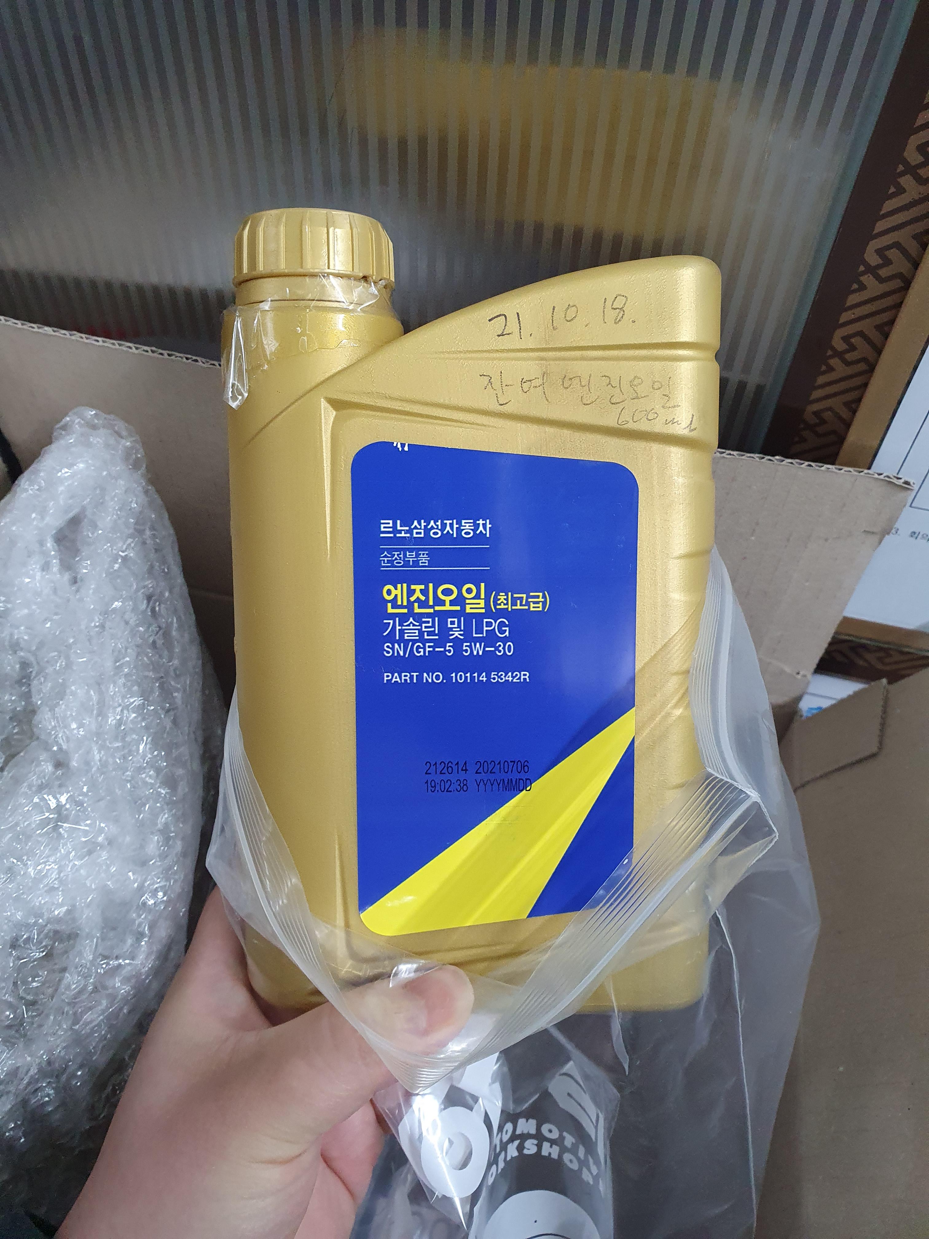 공임료 16000원 + 부품대 38200원 = 54200원에 sm7lpe 모델 엔진오일을 교환하였습니다.