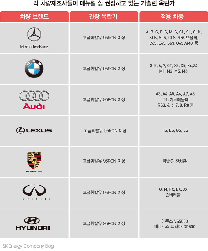 그럼 어떤 자동차들이 고급유를 넣어하는지 봅시다!