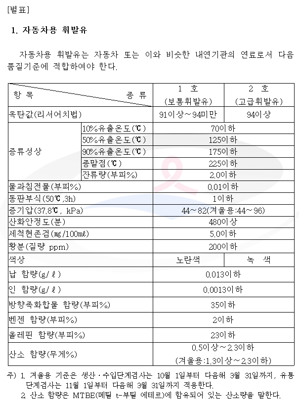 위 사진의 출처 산업자원부 [석유제품의품질기준과검사방법및검사수수료에관한고시] 파일은 아래에서 자세히 파악가능합니다.