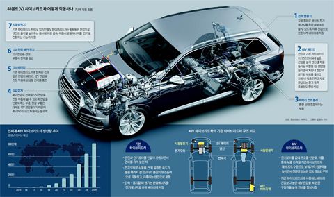 마일브 하이브리드 차량은 그냥 내연기관차랑 거진 동일한데.. 자동차의 전압 장치를 기존 12볼트에서 48볼트로 올려서