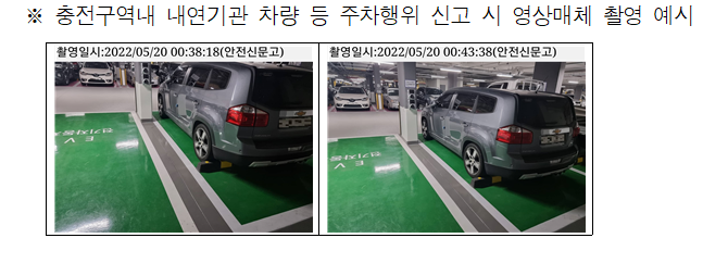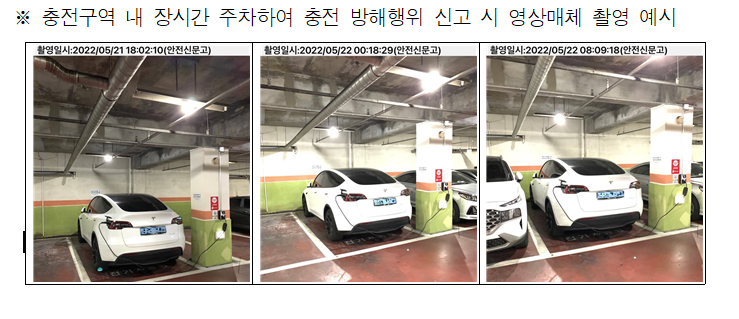 등록시간과 차량번호, 주차공간이 전기차 충전구역 표시가 잘나오게 사진 또는 동영상을 찍어야 합니다.