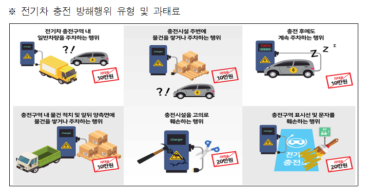 전기차 충전기 방해행위를 하게 되면, 최대 20만원의 과태료를 처분을 한다고 보도자료를 냈습니다.