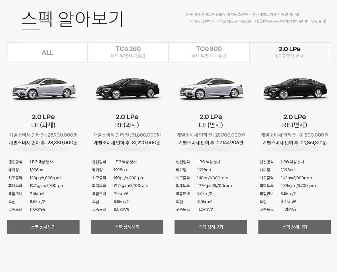 : 1.3 TCe 260 가솔린 터보 직분사 / 1.8 TCe 300 가솔린 터보 직분사 / 2.0 LPe LPG 직분사 트림