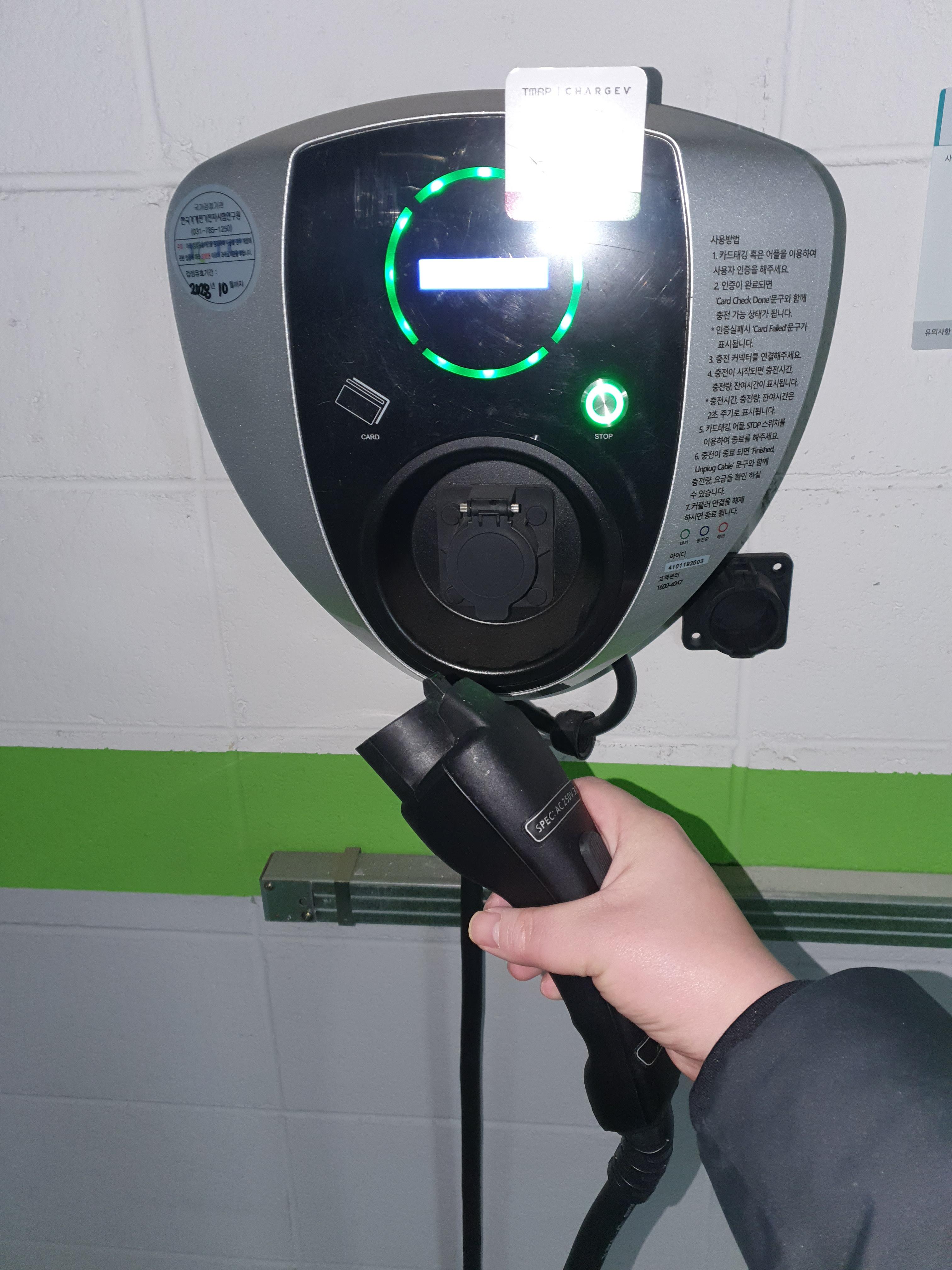 아파트에 있는 전기차 충전기로는 충전 젠더가 필요합니다.