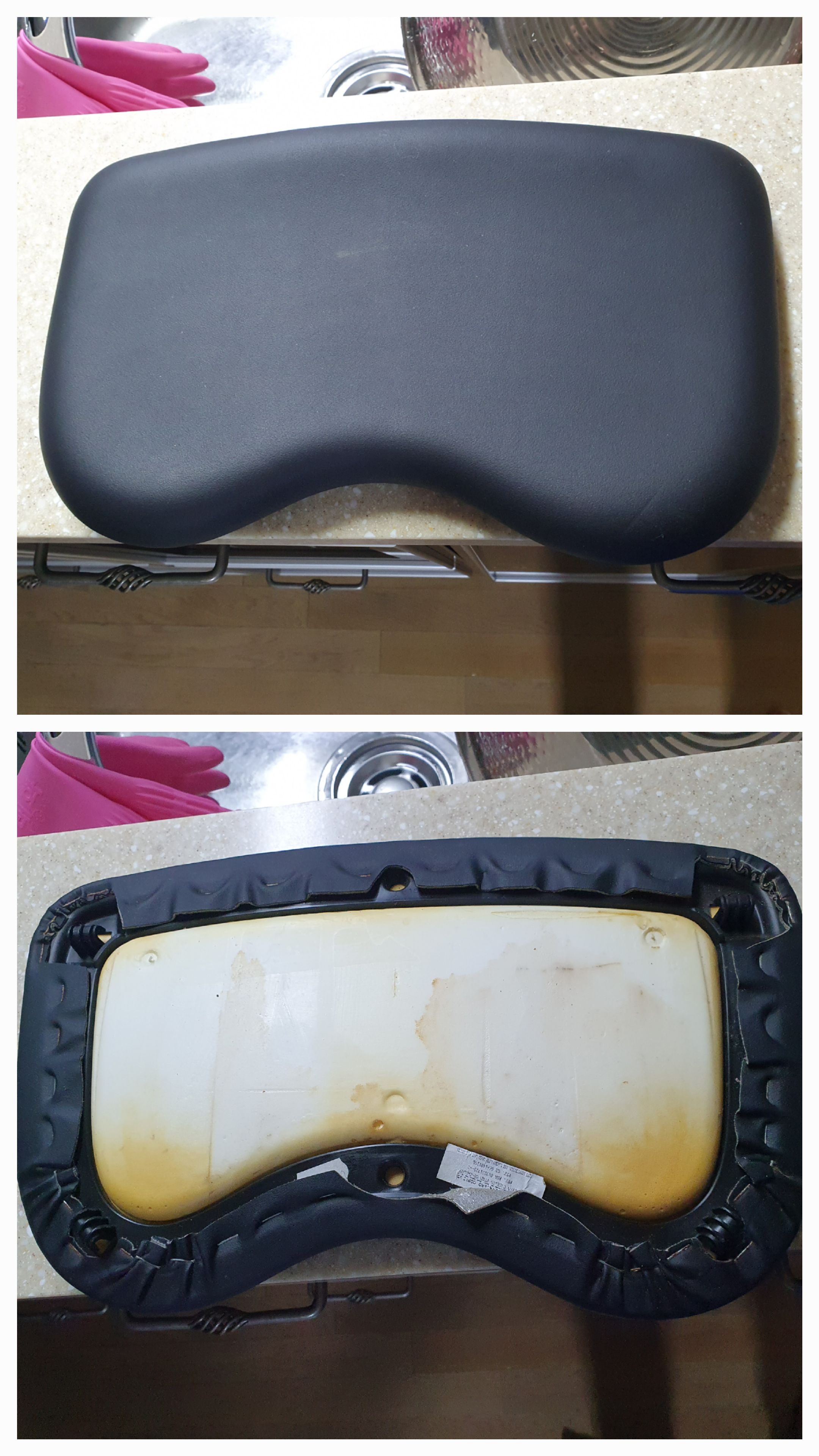 물로 닦으면, 시트 쿠션 스폰지가 물을 먹게 됩니다.