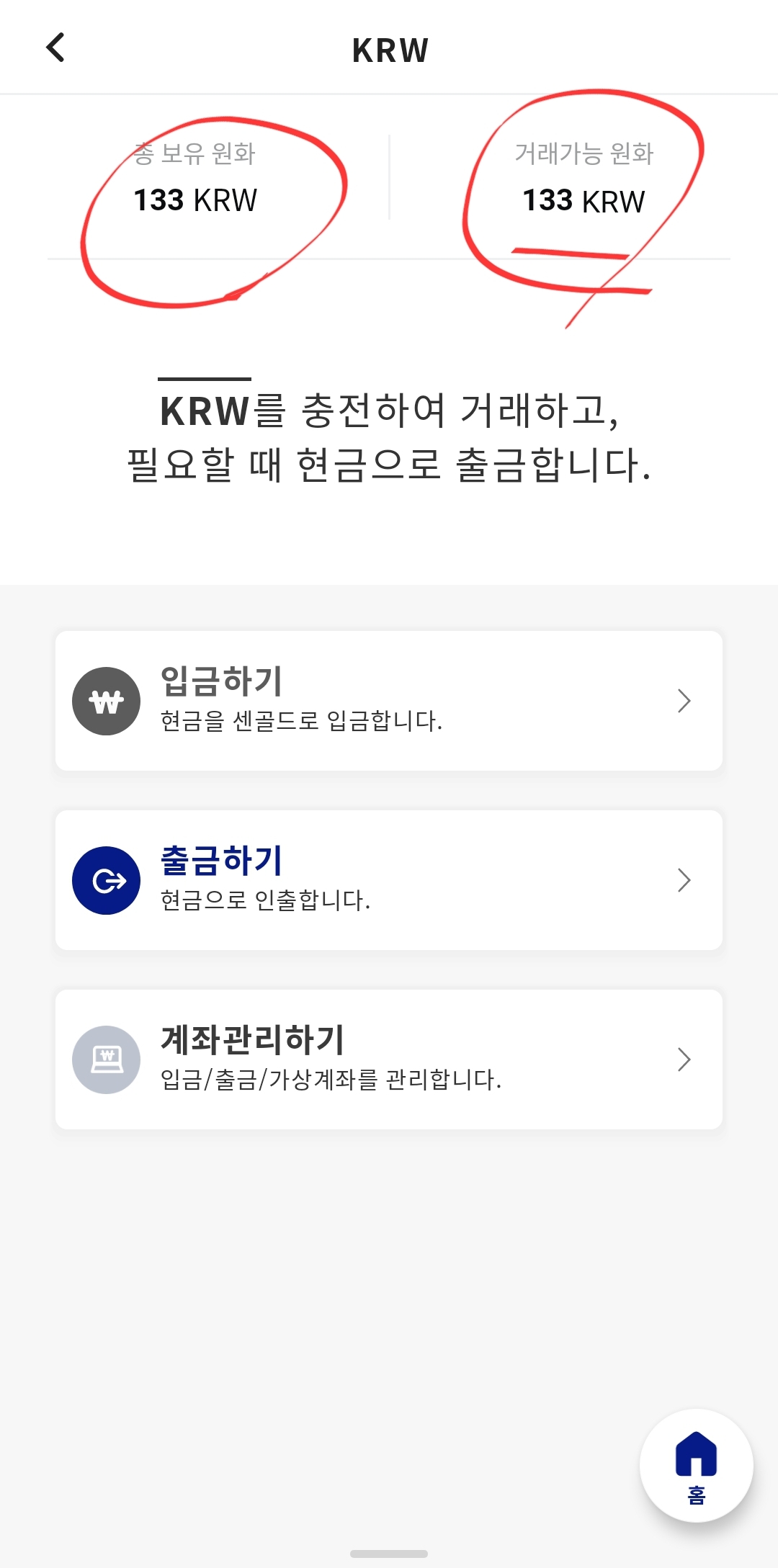 5. 조금 지나면 매도가 완료가 됩니다. 그렇게 되면 아래처럼 보유 원화, 거래 가능 원화 금액이 써진 사항을 확인할 수 있어요.