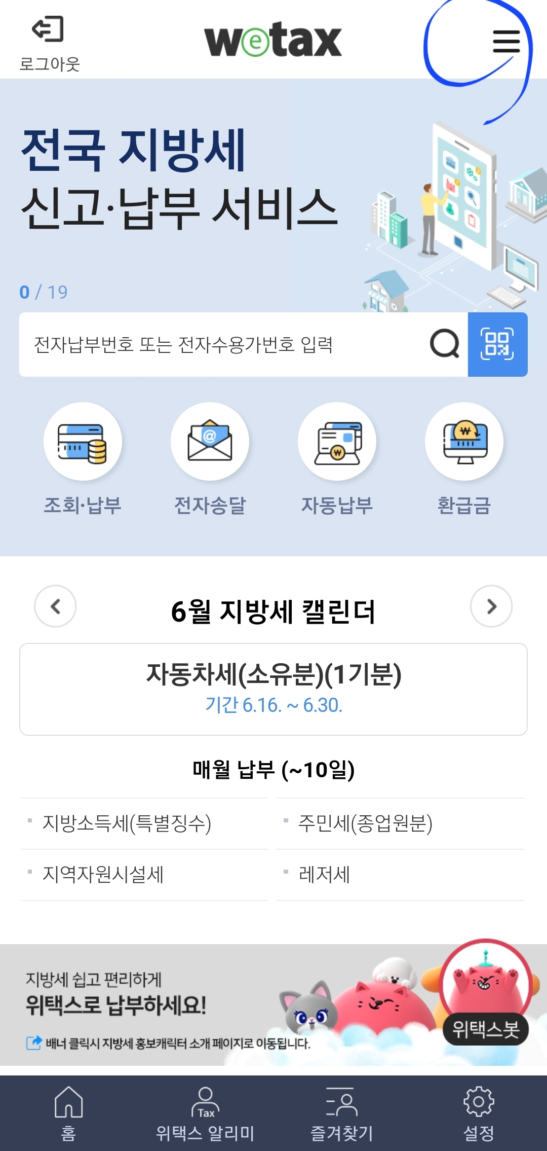 2. 위택스 앱 오른쪽 3줄을 선택한다.