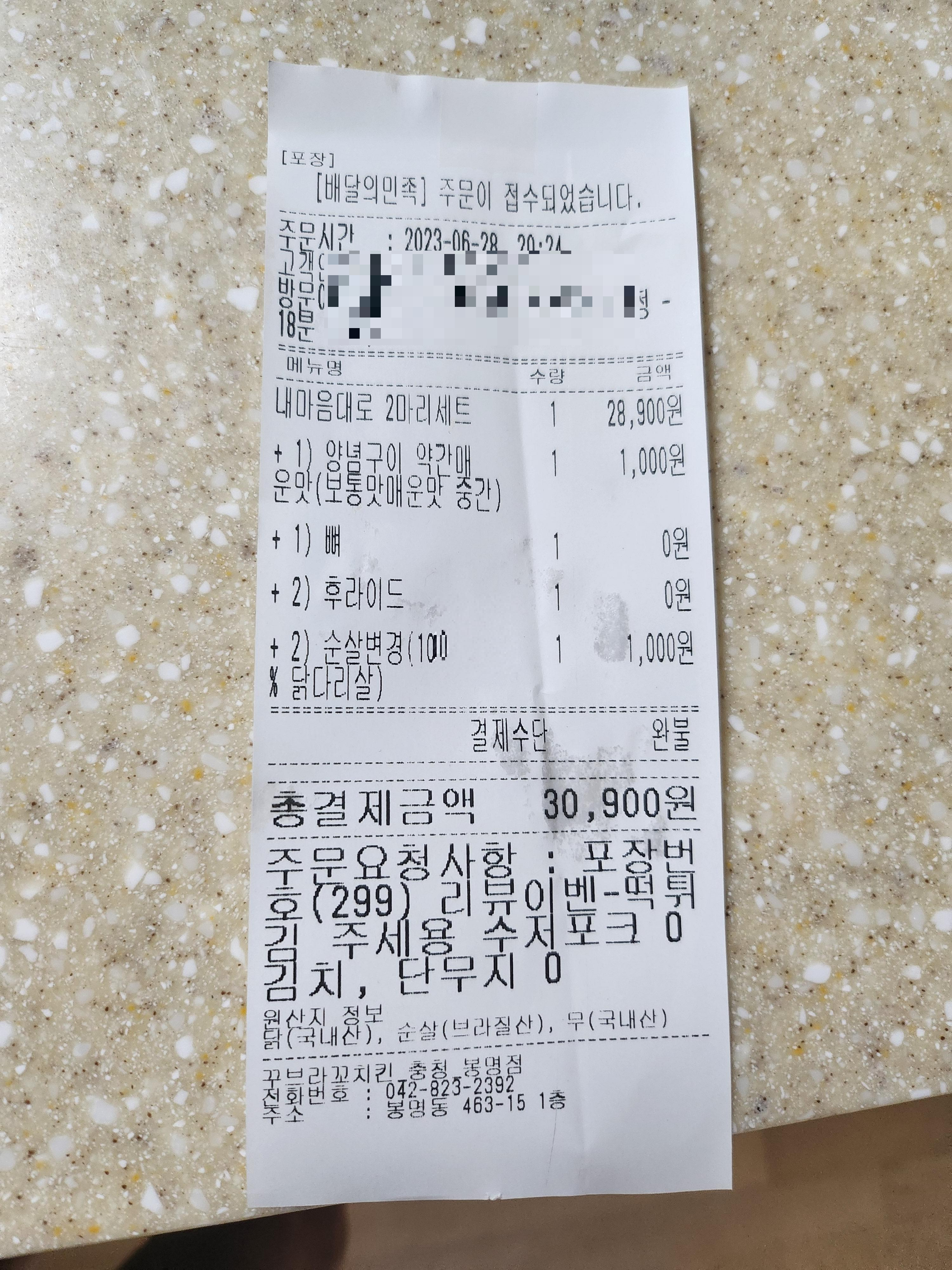 배민에서 2천원 쿠폰을 풀어서 28900원에 결제하고 포장을 해왔습니다.