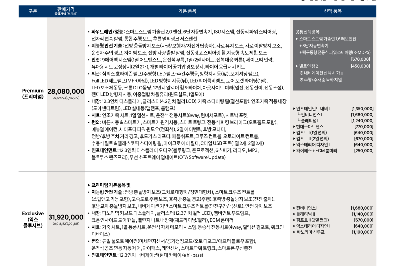 우리가 어느정도 쏘나타의 옵션과 트림별 적정가격을 생각해보면, 익스클루시브 모델은 선택을 해야