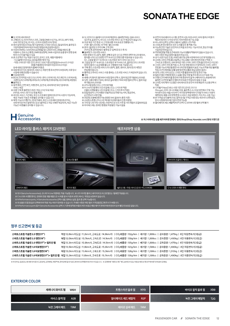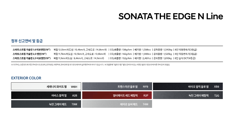 | 쏘나타 디엣지 | 2.0 가솔린 | 2.0 LPG (일반인) | 2.0 LPG (장애인) | 2.0 LPG (렌터카) | 2.0 가솔린 N라인 |