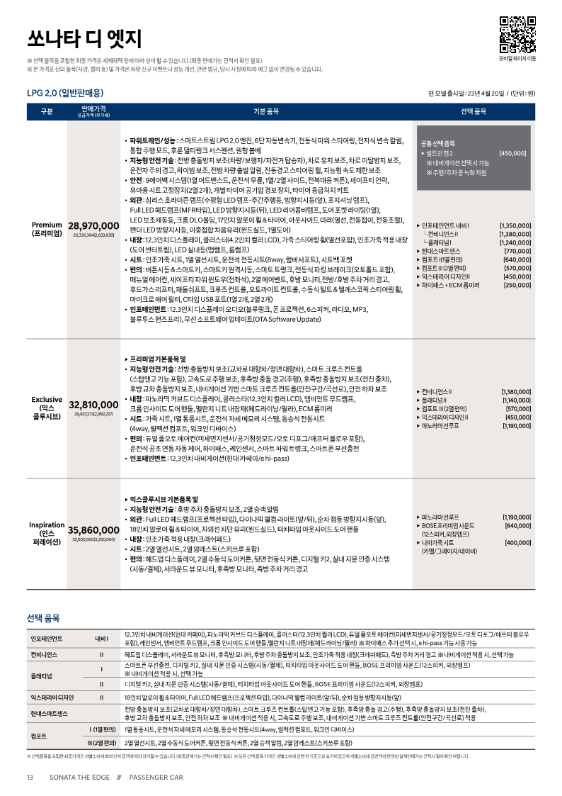 2. 쏘나타 디엣지 LPG 2.0 (일반인용) 모델 가격표