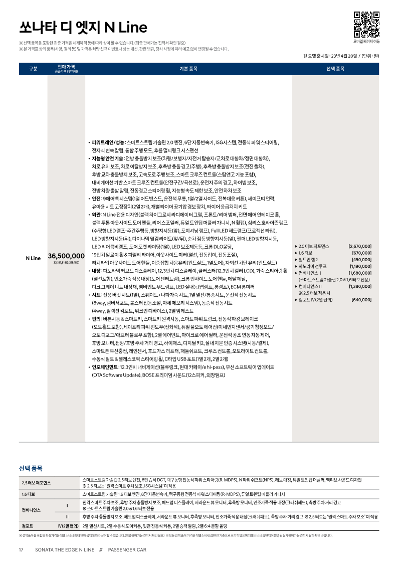 5. 쏘나타 디엣지 N LINE 모델 가격표
