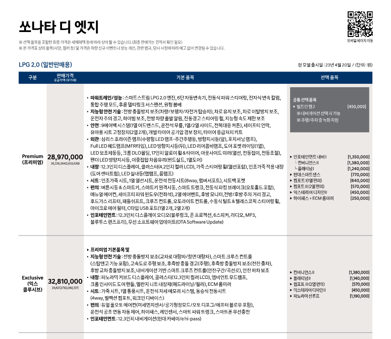 가성비 쏘나타를 뽑으실 분들은 꼭 LPG 2.0 익스클루시브 모델로 가시길 바랍니다.