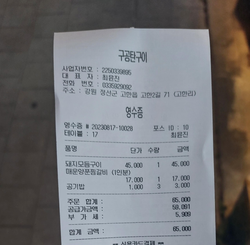 정말 맛있게 먹었는데 가격은 65,000원 강원도 정선이 관광지잖아요.