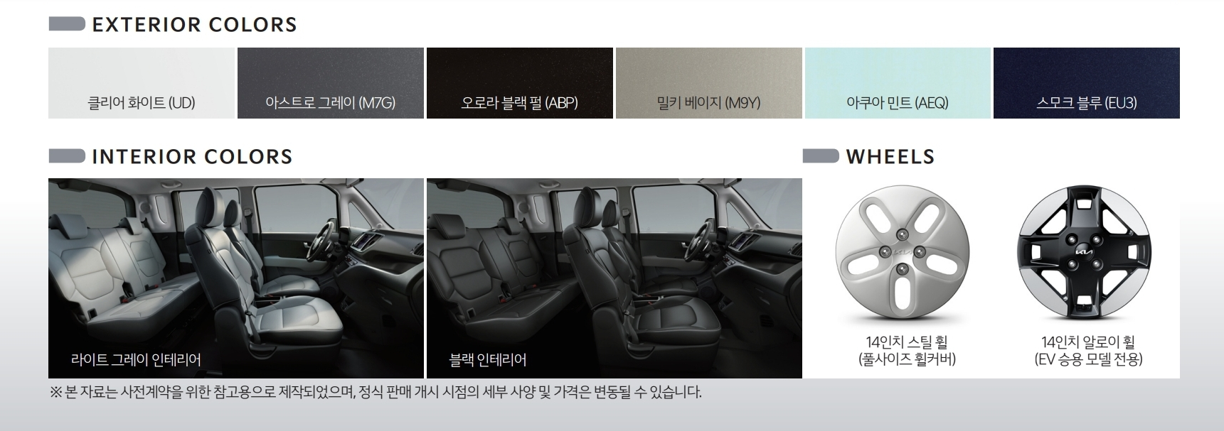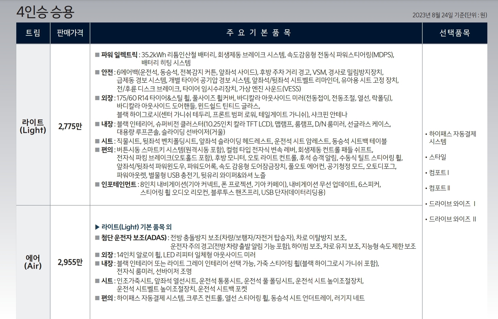 그럼 레이 전기차 레이 EV 가격표를 보시도록 하겠습니다.