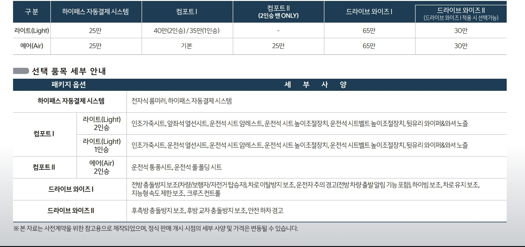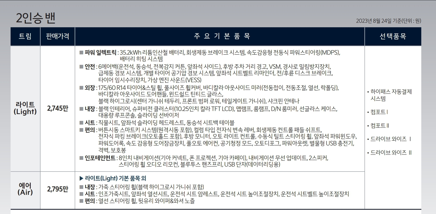 아래 파일은 레이EV 가격표입니다. (출처 기아차 홈페이지)