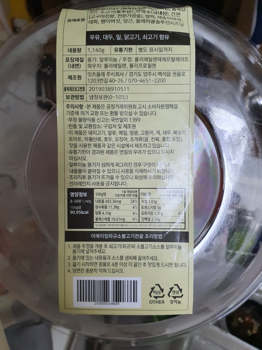 소고기전골 조리법은 맨 밑에 바닥에 써져 있습니다.