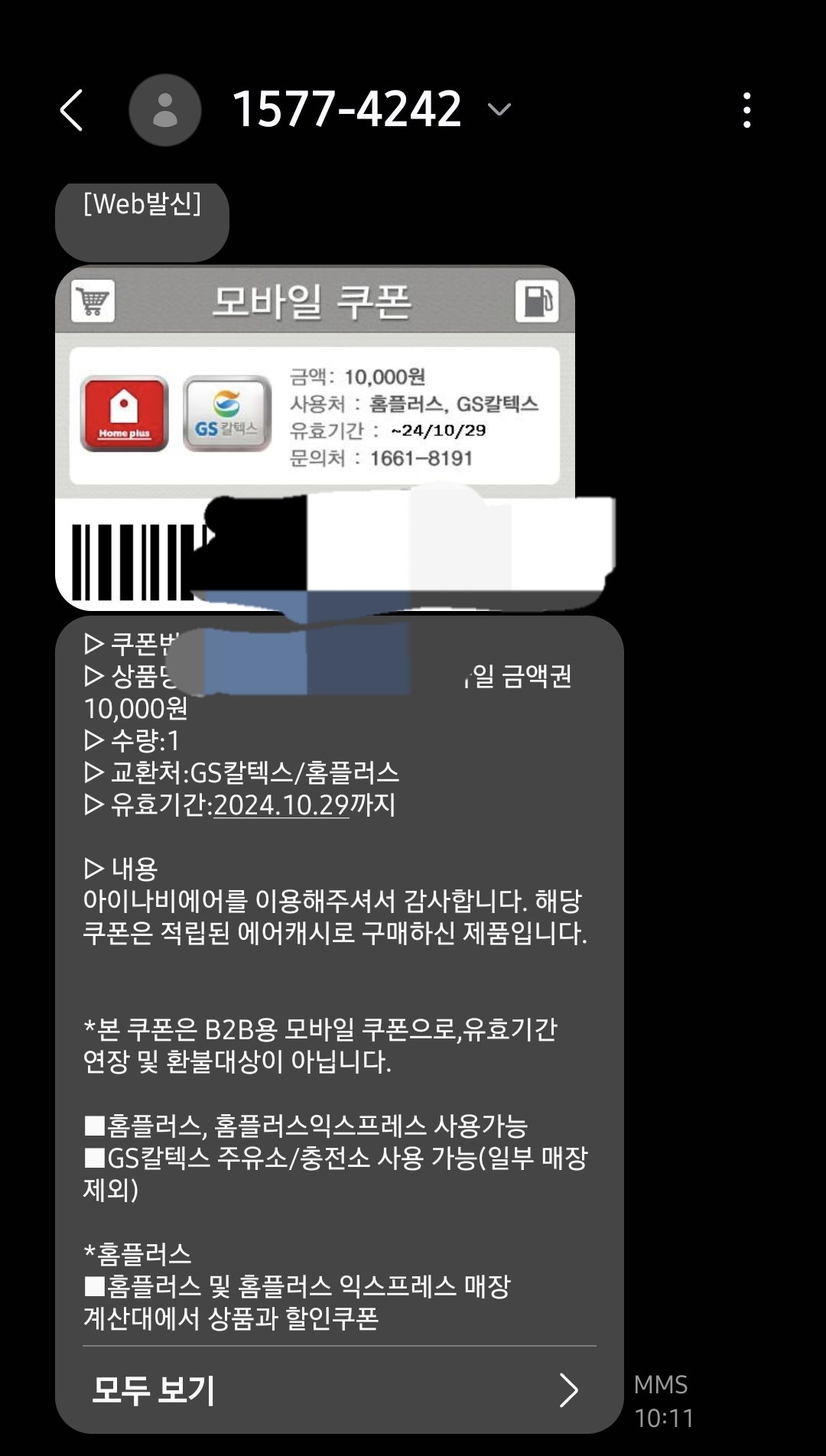 4.그럼 본인의 휴대번번호가 나오고, 쿠폰이 바로 전송됩니다.