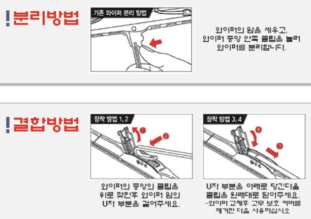 아래 사진을 보면 와이퍼 암에 ㄷ 자 모양의 걸쇠가 있어요. 거기에 와이퍼 블레이드가 걸려 있습니다.