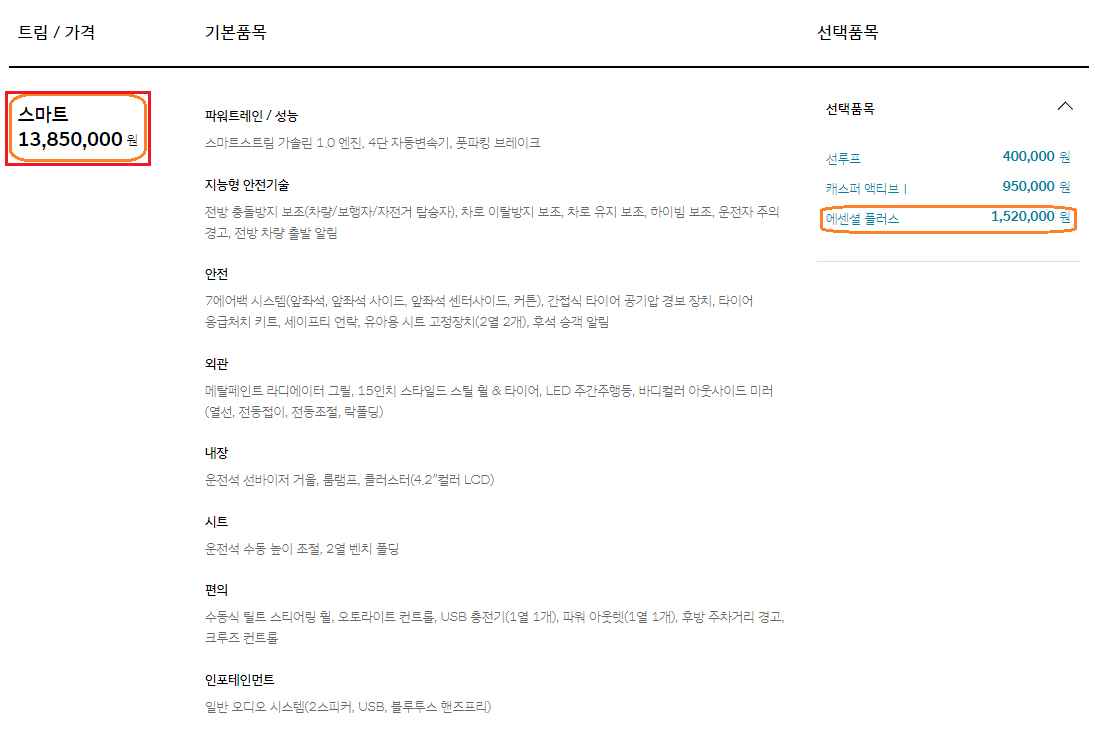 그냥 캐스퍼는 스마트트림 + 에센셜플러스만 조합해서